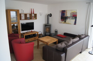 Unser Ferienhaus betreten Sie über den Flur mit Garderobe und Spiegel. Im Wohnbereich steht ein Kamin, eine große Couch, zwei Sessel, ein Clubtisch, ein Wohnzimmerschrank mit TV, DVD-Player und