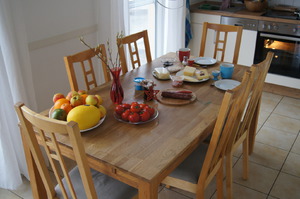 Der Esstisch mit 6 Stühlen verbindet den Wohnbereich mit der offenen Küche. Diese ist ausgestattet mit einem Ceranfeldherd mit Backofen, einem Geschirrspüler, einer Mikrowelle, einer