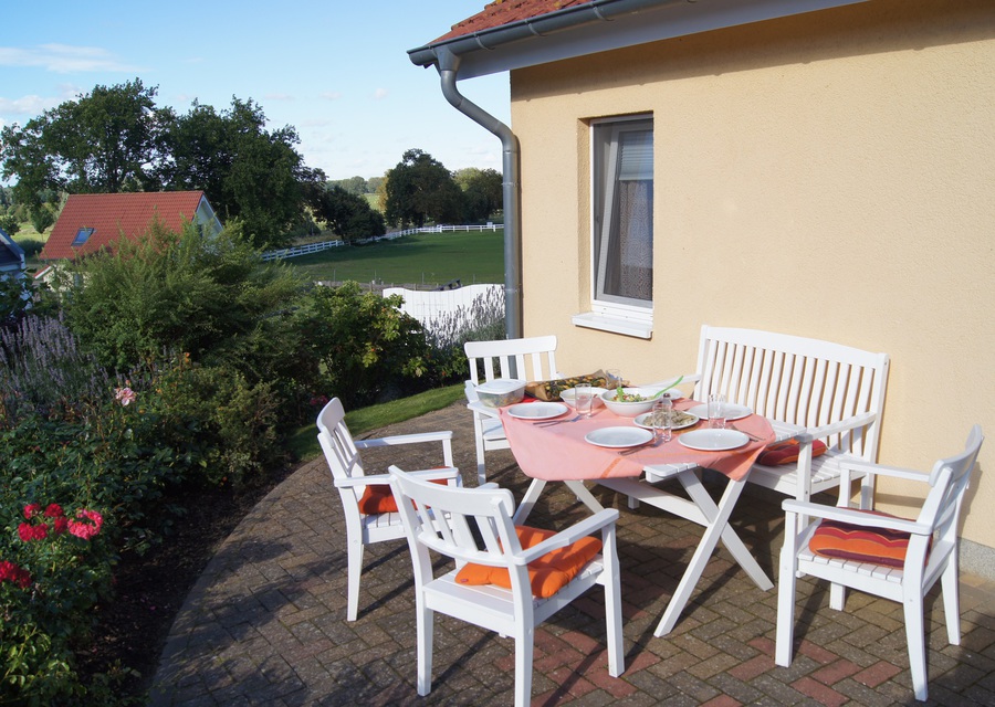 Am Haus befinden sich auf beiden Seiten großzügige Terrassen mit Gartenmöbeln, eine weitere im Garten. Ein Holzkohlegrill steht zur Verfügung. Für Ihren PKW ist ein Stellplatz vorhanden.